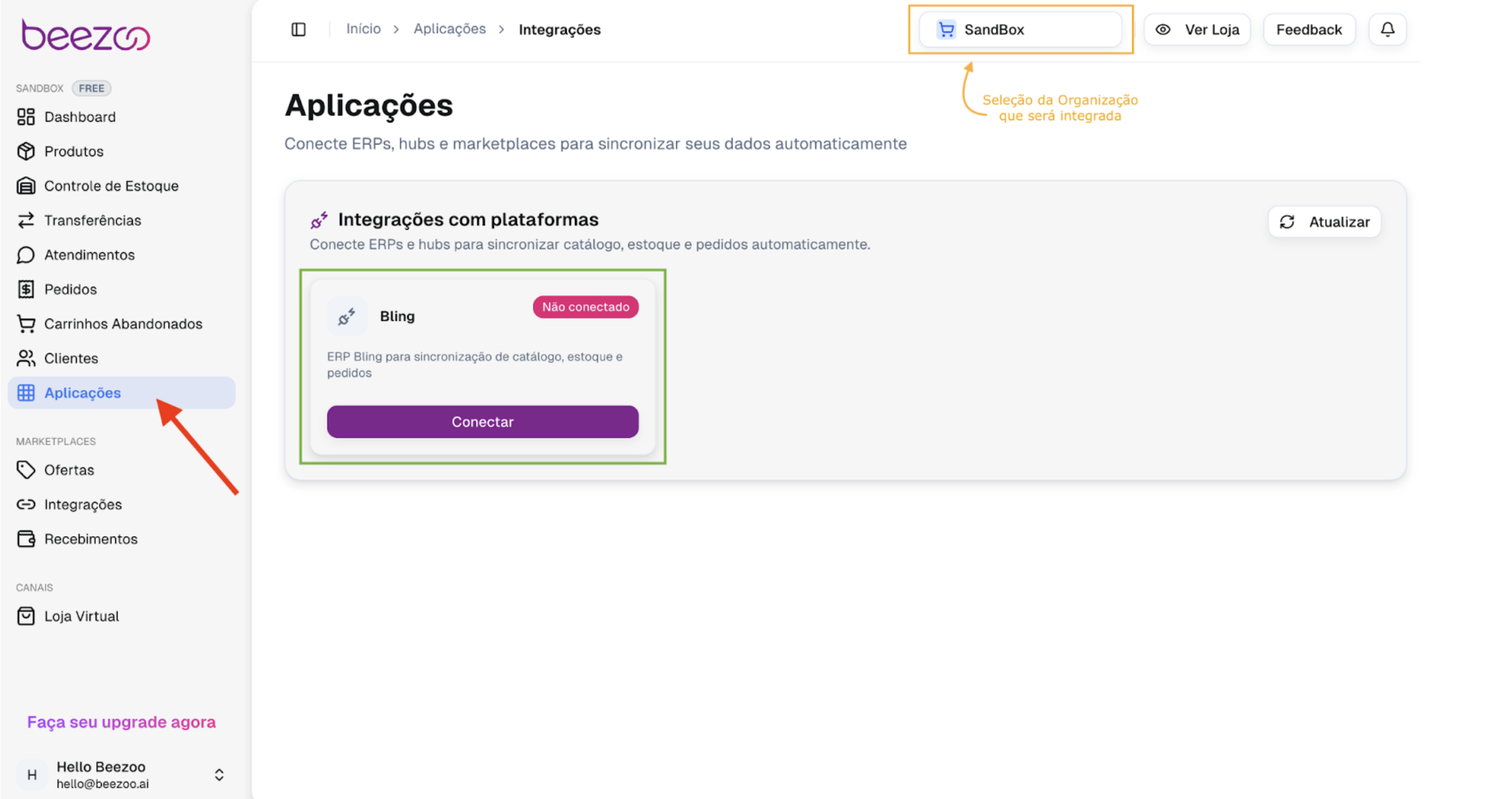 Depois, no menu lateral, navegue para a aba Aplicações (indicado pela seta vermelha), localize a opção referente ao Bling (indicada pelo marcador verde) e clique em Conectar.