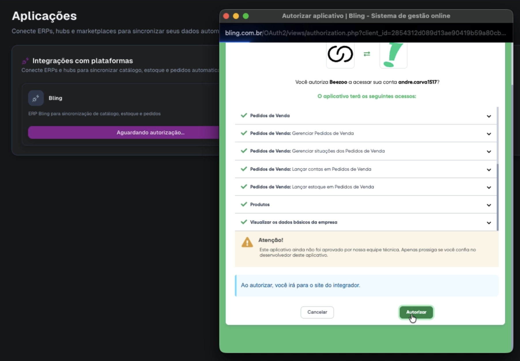 Faça o Login com suas credenciais Bling usando um login "master" e autorize a Aplicação: