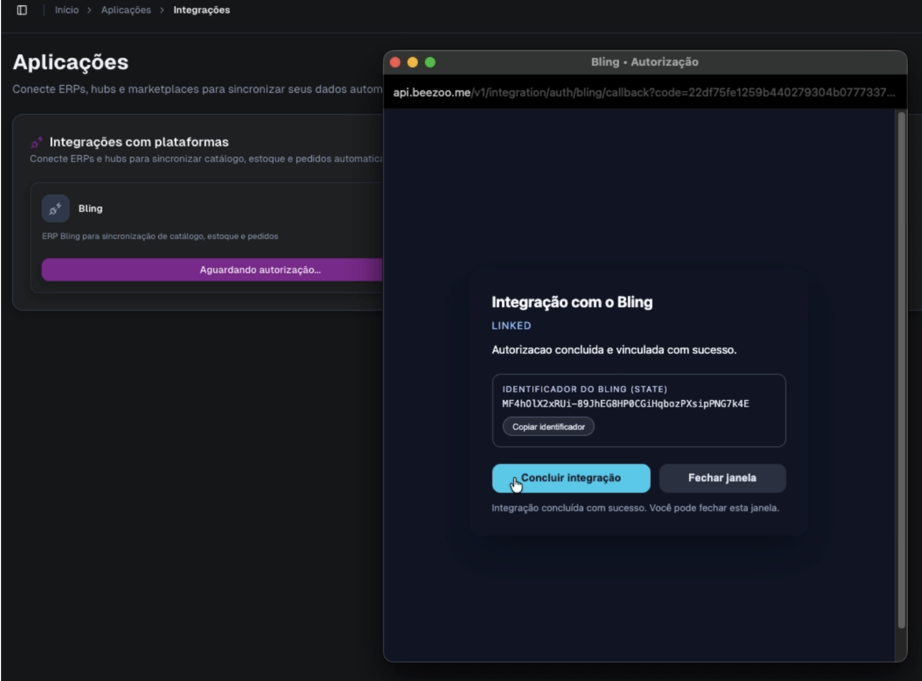 Após aparecer a mensagem de sucesso "Autorização concluída e vinculada com sucesso", clique em Concluir Integração.